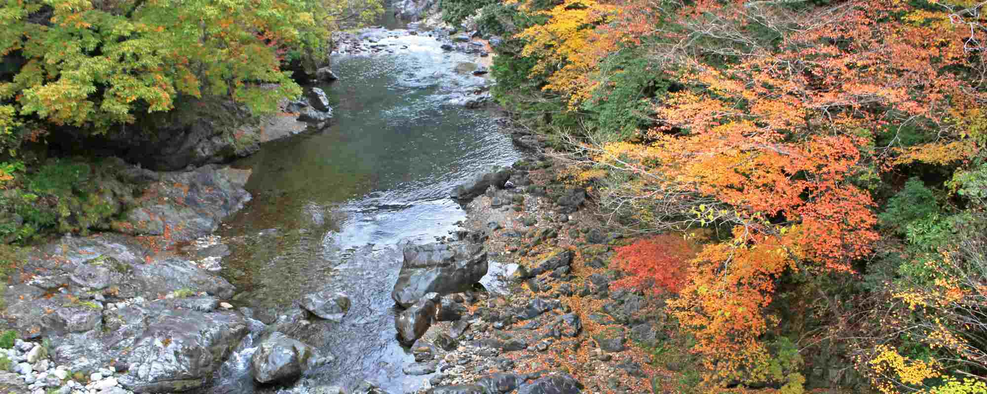 近畿屈指の渓谷美。滝や淵、清らかな水が流れる。約7kmの道は新緑・紅葉ともに美しい。